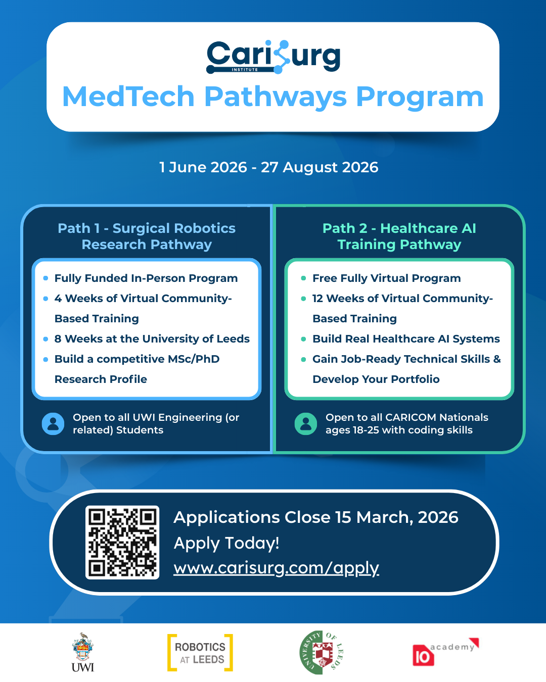 CariSurg aims to bridge the gap in the Caribbean where, despite strong interest in surgical robotics, AI, and medical technology, a lack of hands-on research opportunities drives skilled students away and isolates them from global innovation networks. The organisation is transforming Caribbean Healthcare through technology and talent.
