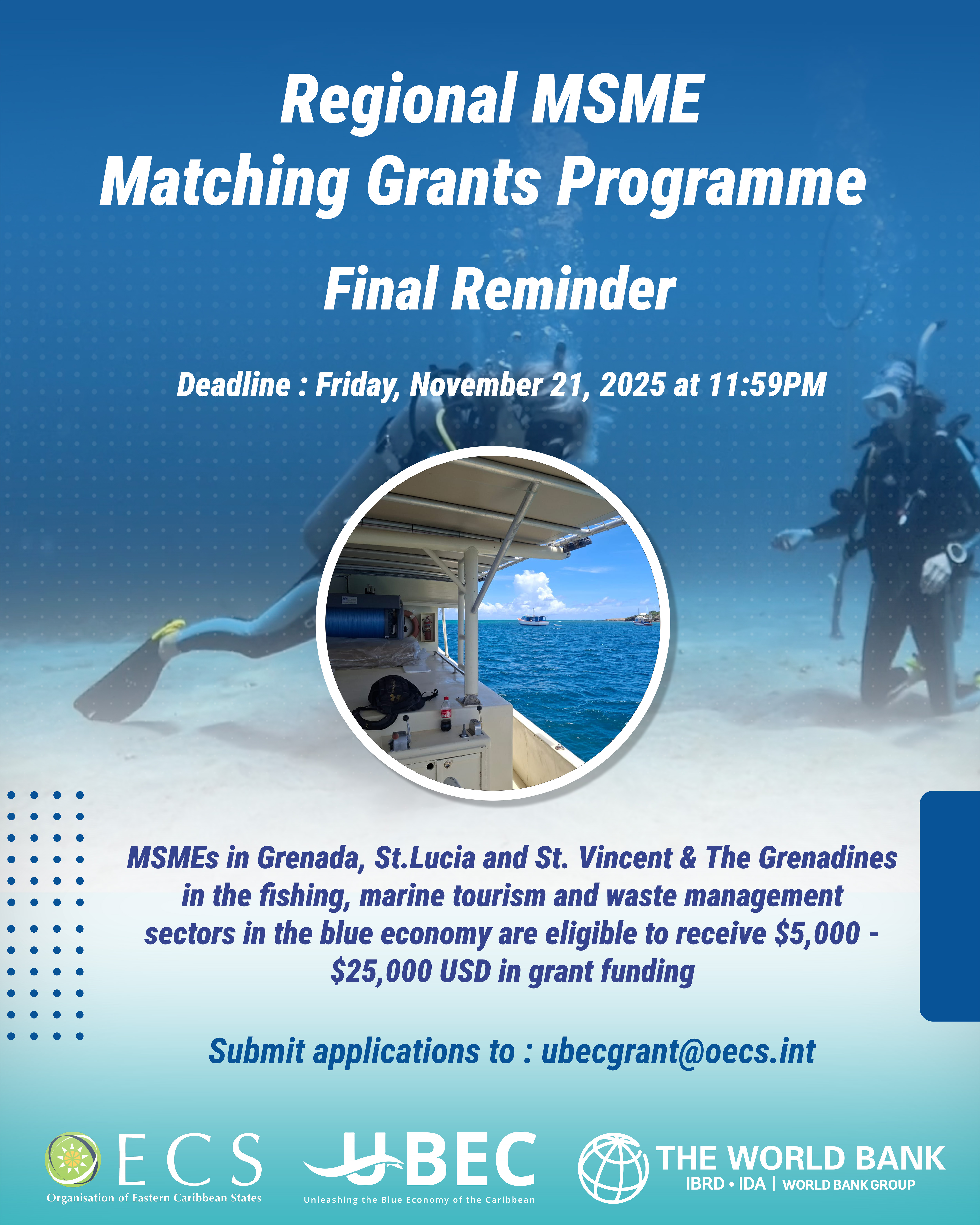 The Organisation of Eastern Caribbean States (OECS) Commission, through the Unleashing the Blue Economy of the Caribbean (UBEC) Project, is reminding all Micro, Small and Medium-sized Enterprises (MSMEs) in Grenada, Saint Lucia, and Saint Vincent and the Grenadines that the deadline to apply for the 2nd Call for Proposals under Window 1 of the Regional MSME Matching Grants Programme is Friday, November 21, 2025, at 11:59 p.m.