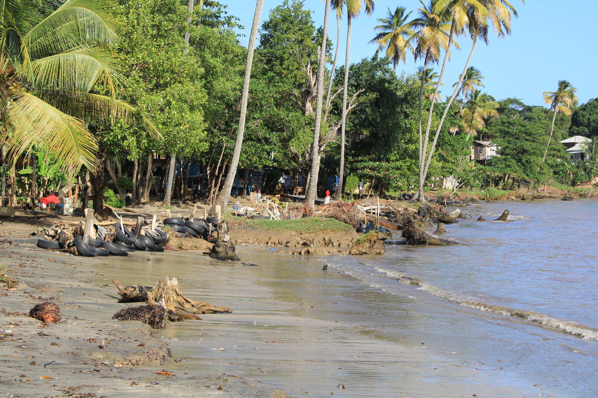 The researchers demonstrate a direct link between healthy reefs and shoreline stability in Grenville Bay, Grenada, showing that healthy reefs reduce the wave energy arriving on shore. Grenville’s healthy reefs keep more than half of the Bay’s coastline intact. In contrast, severe reef degradation is linked with chronic coastal erosion in the northern section of the Bay, where the shoreline is disappearing at a rate of nearly two feet every year. In an attempt to adapt, villagers have built makeshift barriers with tires and driftwood to slow the erosion threatening their homes.
