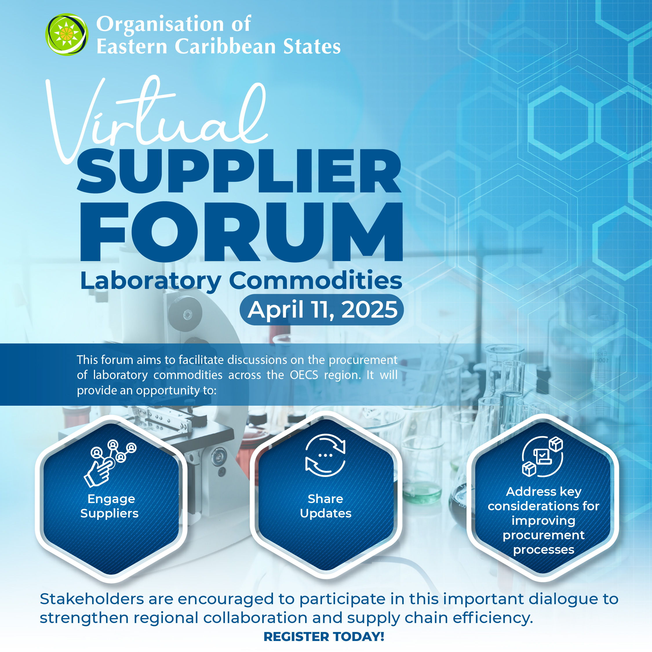The OECS Pooled Procurement Service is hosting a Virtual Supplier Forum. This forum aims to facilitate discussions on the procurement of laboratory commodities across the OECS region. It will provide an opportunity to engage suppliers, share updates, and address key considerations for improving procurement processes in the OECS. Stakeholders are encouraged to participate in this important dialogue to strengthen regional collaboration and supply chain efficiency.