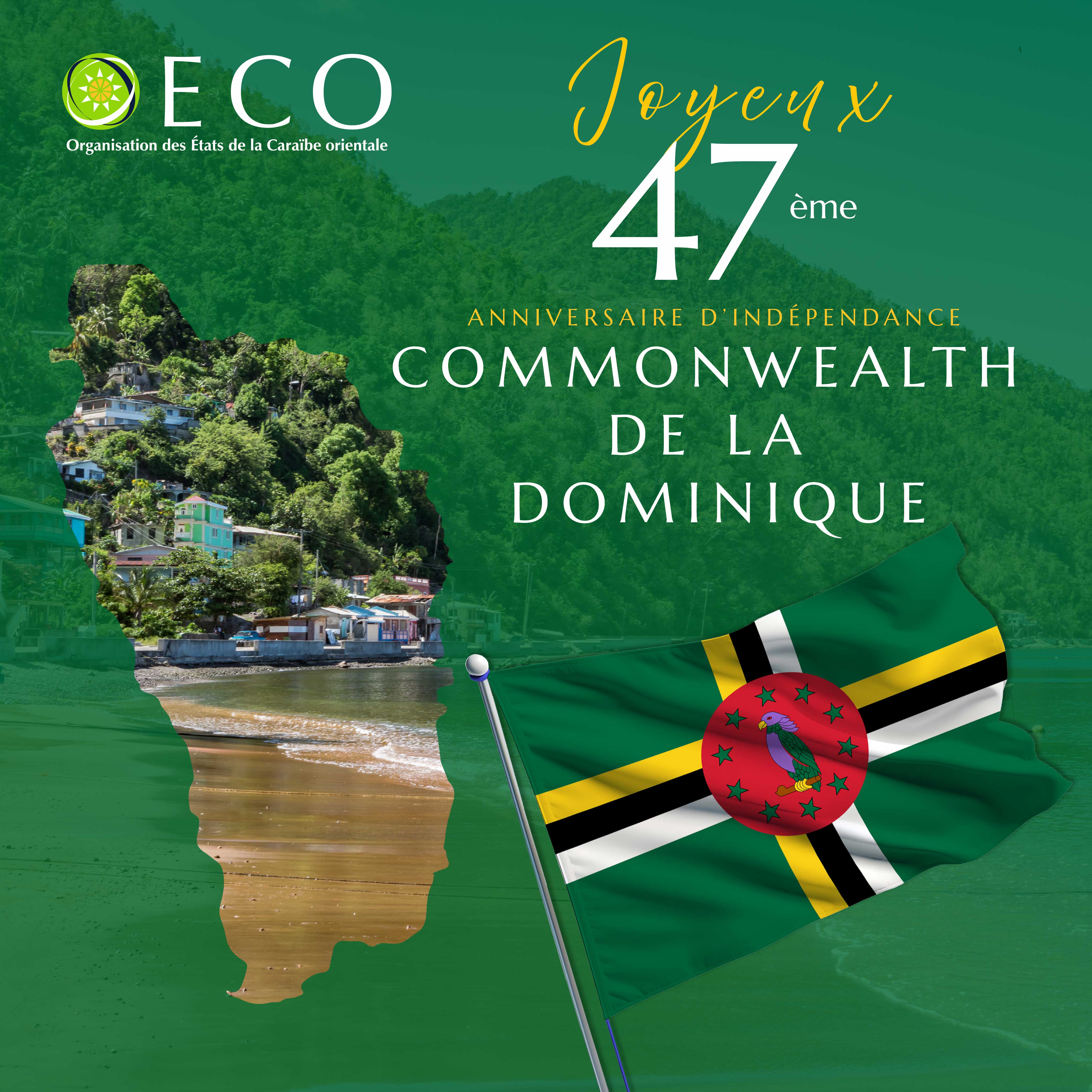 La Commission de l’Organisation des États de la Caraïbe orientale (OECO) adresse ses plus sincères félicitations au gouvernement et au peuple du Commonwealth de la Dominique à l’occasion du 47ᵉ anniversaire de l’indépendance du pays, célébré cette année sous le thème : « 47 ans de progrès et de détermination ».