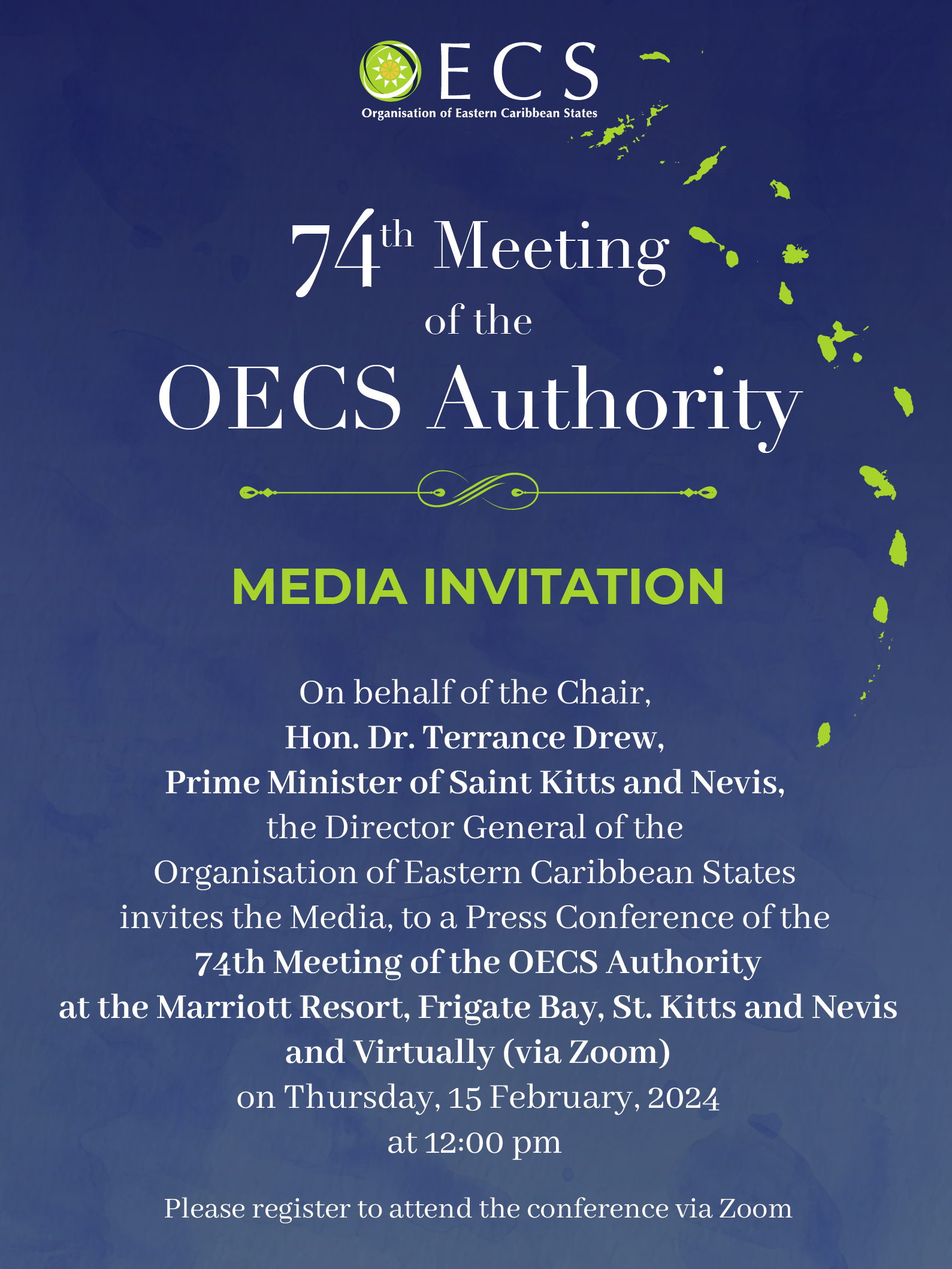 The Meeting is being hosted under the Chairmanship of Hon. Dr. Terrence Drew, Prime Minister of St. Kitts and Nevis. You are invited to join the OECS Authority at a Press Conference to conclude the 74th Authority Meeting.
