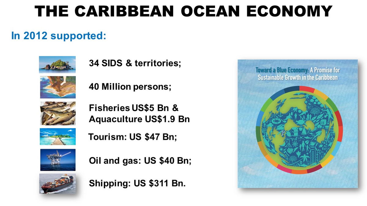 In a joint publication, the Caribbean Development Bank (CDB) and the UN Development Programme (UNDP) estimate that by 2030, based on current trajectories, the global ocean’s value-added will amount to US$4.5 trillion, with employment rising to over 40 million people. Furthermore, both the CDB and the UNDP also estimate that the total global value of key ocean assets stands at roughly US$24 trillion based on the ocean’s earning capacity through direct outputs such as fishing and aquaculture; and indirect outputs such as tourism, trade and transportation. In our specific case, although the Caribbean Sea covers 1% of the earth, the value of our Blue Economy is estimated to be US$407 Billion (the equivalent of 14% of our combined GDP). The proportion of our marine space to our land mass is 85:1 and in some Caribbean States, the Blue Economy employs up to 30% of the labor force. Additionally, in 2012, we estimate that fisheries and aquaculture generated US$5B and US$1.9B respectively. Other industries that constitute part of the Blue Economy included Tourism US$47B; Oil & Gas US$40B and Shipping US$311B.