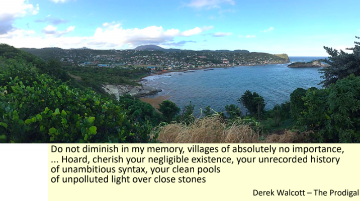 "Do not diminish in my memory villages of absolutely no importance, ... Hoard, cherish your negligible existence, your unrecorded history of unambitious syntax, your clean pools of unpolluted light over close stones." Derek Walcott – The Prodigal