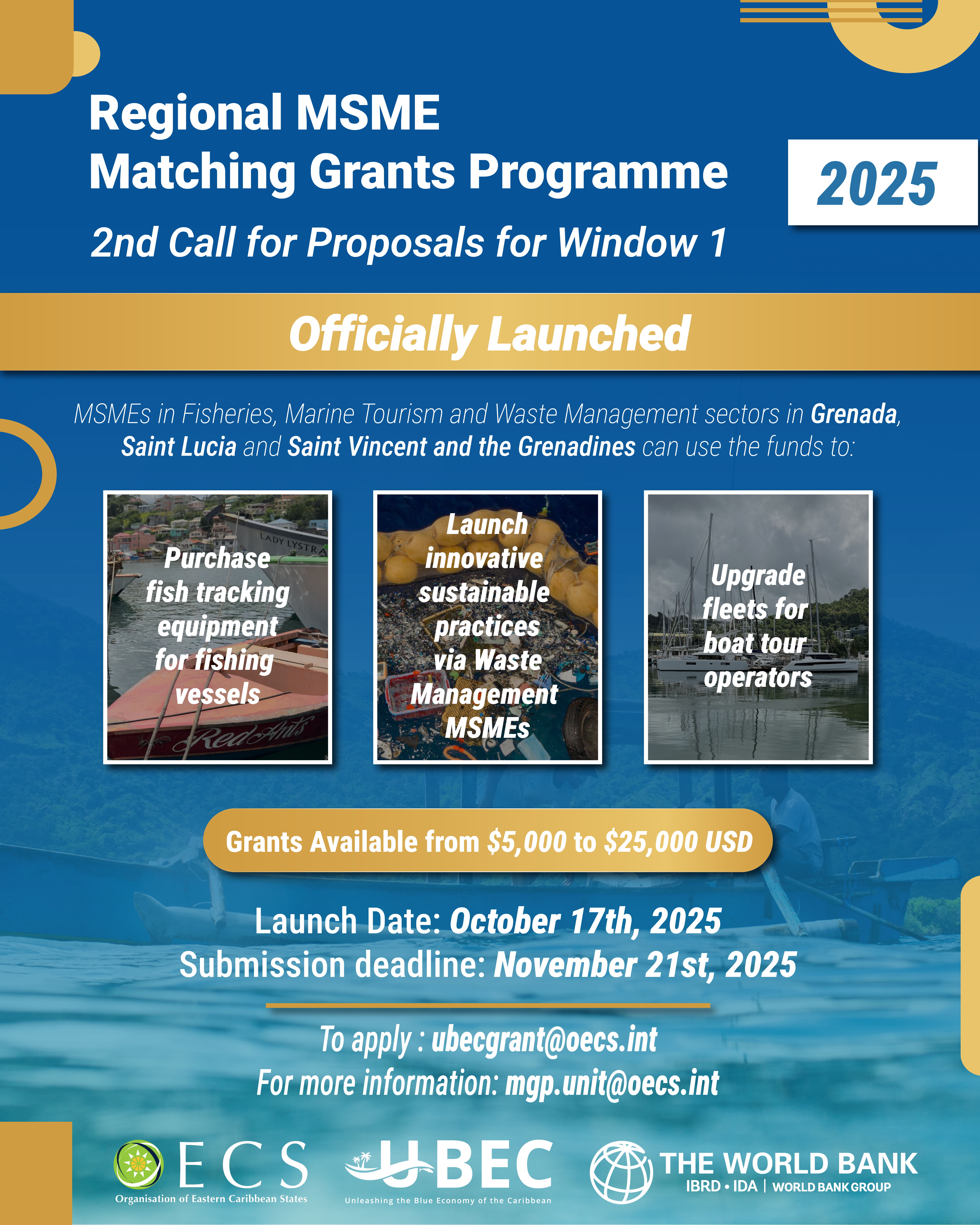 The Organisation of Eastern Caribbean States (OECS) Commission, through the Unleashing the Blue Economy of the Caribbean (UBEC) Project, officially launched the 2nd Call for Proposals for Window 1 of the Regional MSME Matching Grants Programme on Friday, October 17, 2025, during a virtual event attended by entrepreneurs, policymakers, and development partners.