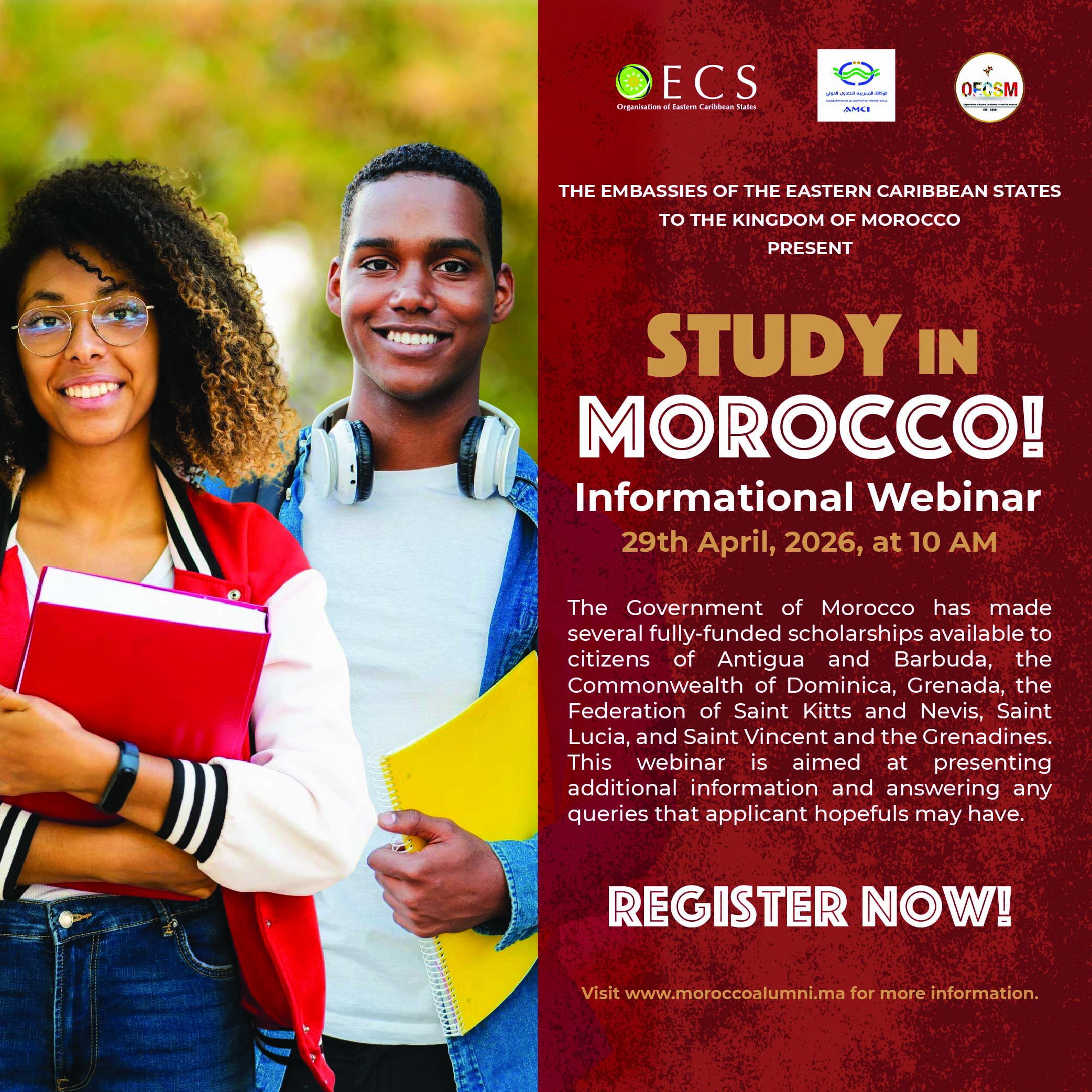 To assist with the application process, the Embassies of the Eastern Caribbean States in Morocco, in collaboration with the Organisation of Eastern Caribbean Students in Morocco (OECSM) and the Moroccan Agency for International Cooperation (AMCI), are hosting an informational webinar to inform potential applicants about the application process for each member state. The webinar will feature students currently participating in the scholarship and administrators to give deep insight into questions from attendees. The topics that will be covered at the webinar include: