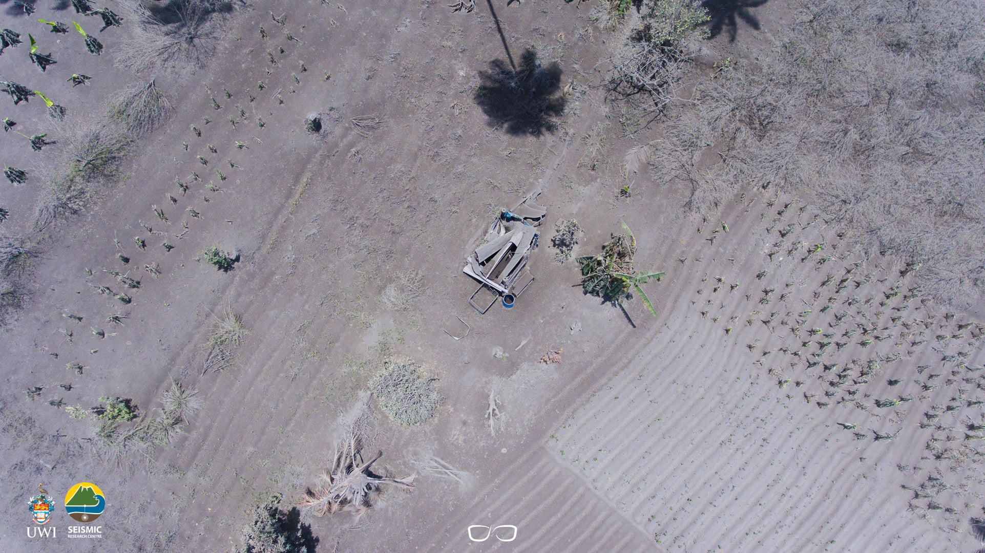 Header image shows an aerial shot showing farmlands in the Sandy Bay area of St. Vincent (Windward side of the island) that are covered with ash and the structures have collapsed. Photo credit: Javid Collins, UWITV.