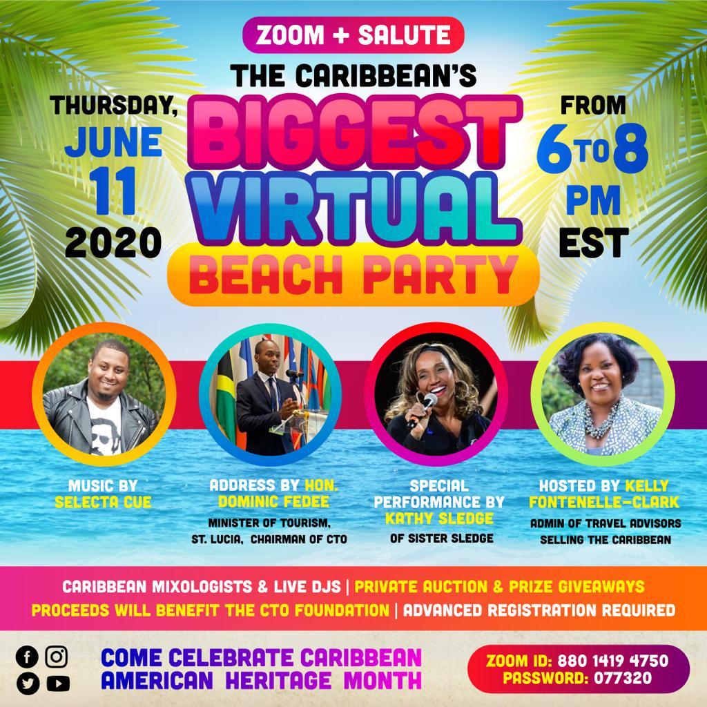 June 11 - The Caribbean’s Biggest Virtual Beach Bash. A Zoom party celebrating Caribbean culture with a special performance by R & B singer Kathy Sledge of Sister Sledge. In addition to interactive fun activities and lots of prizes, there will be an online auction to benefit the CTO Foundation. The event starts at 6 p.m. and ends at 8 p.m. EST.