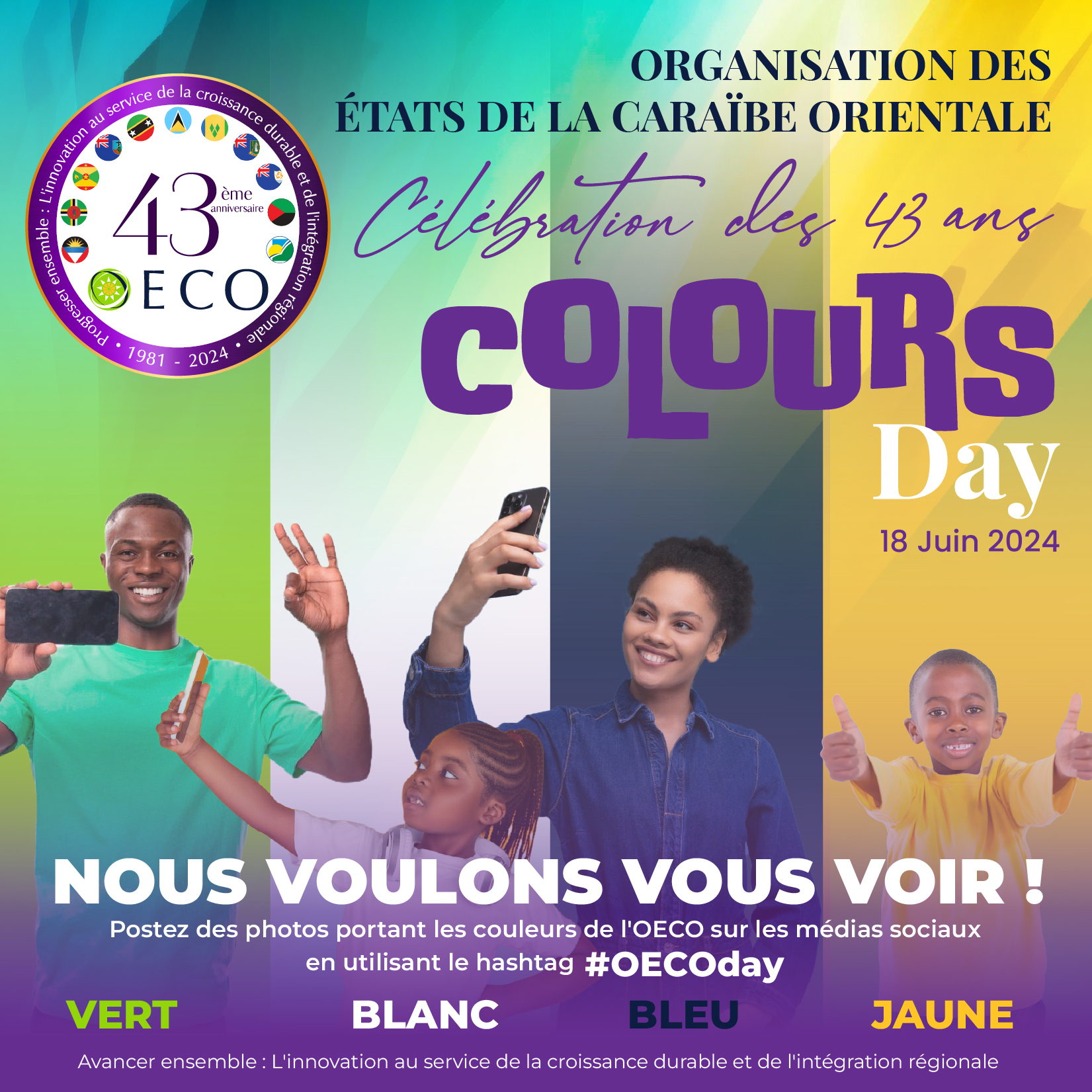 L'Organisation des États de la Caraïbe orientale (OECO) a le plaisir d'annoncer que tous les citoyens des 11 États membres peuvent participer à la célébration de son 43e anniversaire le 18 juin. La "Colours Day" de l'OECO est une activité sans frontières qui encourage tous les citoyens d'Anguilla, d'Antigua-et-Barbuda, des îles Vierges britanniques, de la Dominique, de la Grenade, de la Guadeloupe, de la Martinique, de Montserrat, de Saint-Kitts-et-Nevis, de Sainte-Lucie et de Saint-Vincent-et-les-Grenadines à porter les couleurs de l'OECO : le vert, le blanc, le bleu marine et le jaune.